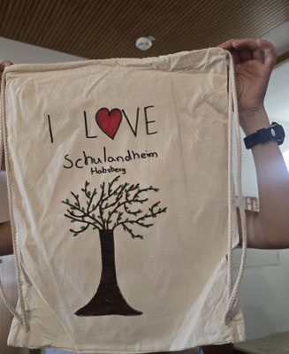 Am Nachmittag bemalten wir Turnbeutel als Erinnerung ans Schullandheim. Einige Kinder haben Natur gemalt oder Tiere und Menschen, andere haben etwas geschrieben und manche haben die Unterschriften von allen auf ihre Tasche schreiben lassen. Dann wurde das Tagebuch weiter ausgefüllt und es gab auch wieder Freizeit mit Rasensprenger, Tischtennis und kurz vor dem Abendessen – vorher war es viel zu heiß - Fußball. Am Abend war Kinoabend! Es gab zwei Filme zur Auswahl. Nach der Vorlesezeit um halb zehn gingen wir dann wieder ins Bett.